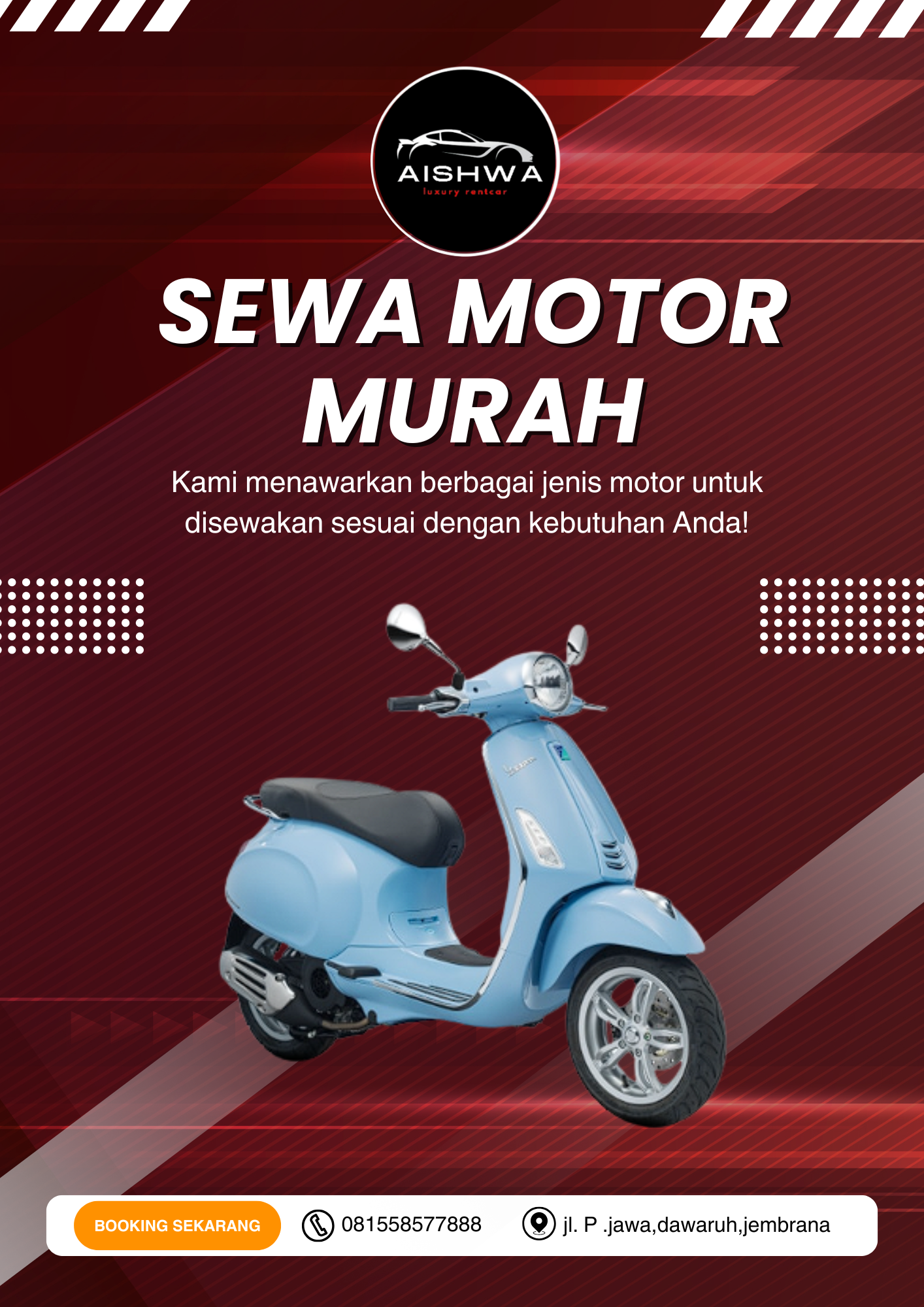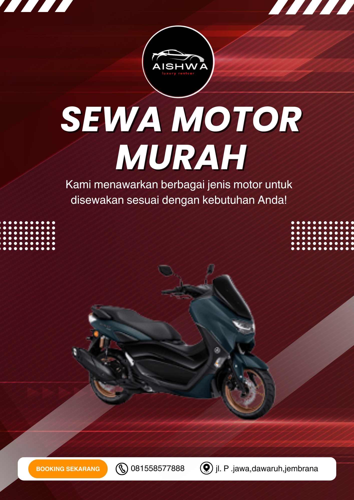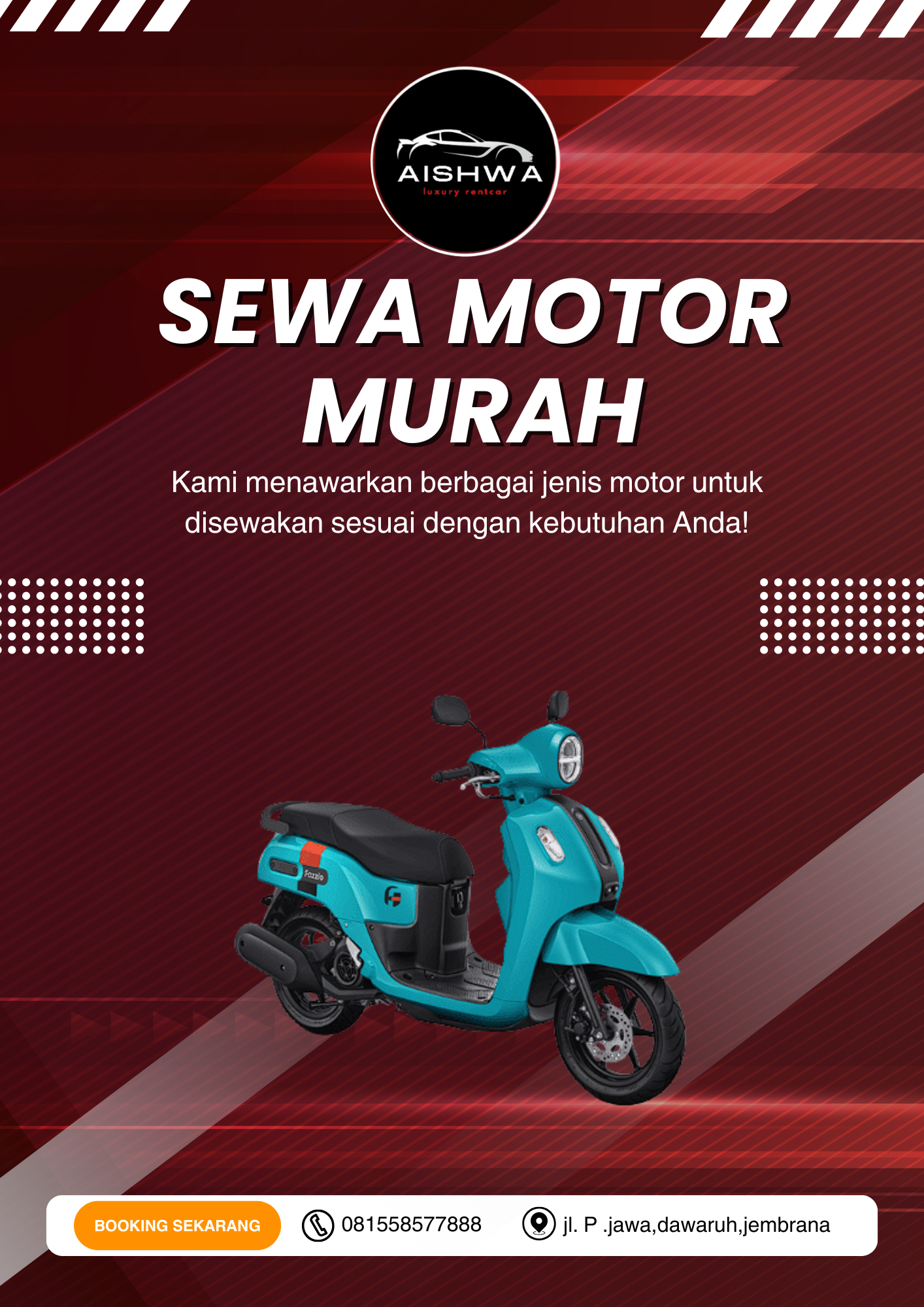 Aishwa Luxury Rentcar adalah layanan sewa mobil dan motor terpercaya di Bali, siap memberikan kenyamanan dan kemudahan selama perjalanan Anda. Kami menyediakan armada yang bersih, terawat, dan siap pakai, lengkap dengan pelayanan profesional dan harga yang bersaing. Nikmati setiap momen perjalanan Anda bersama kami!